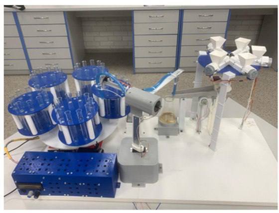 Робот имеет 5 столов, один из которых полностью используется под дистиллированную воду. На каждом из них находится по 10 пробирок. Лаборант выбирает необходимые вещества и их объёмы с помощью блока управления. Далее происходит процесс смещивания составляющих — забор жидких веществ происходит с помощью манипулятора и капиллярной трубки, добавление сыпучих составляющих происходит с помощью дозирования их из ёмкости при помощи шнэка и виброжелоба. Вещества смешиваются в стакане. По итогу проделанной работы был создан робот с автоматизированной системой дозирования жидких и сыпучих химических реагентов.