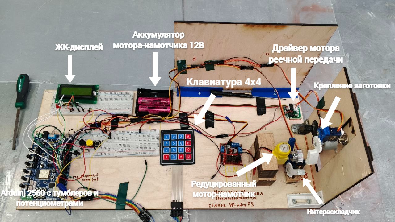 Автоматическая линия по производству бесщеточный электродвигателей включает в себя две ЧПУ установки. Первая наматывает катушки на статор, устройство которой будет подробно описано ниже. Вторая скрепляет и спаивает составные части электромотора. Далее заготовка снимается с помощью перегрузочного механизма и доставляется роботом-погрузчиком на склад. Система питается от одной фазы напряжением 220V. Напряжение проходит через преобразователь и распределительную шину. На активные модули ЧПУ станка поступает 12 Вольт постоянного напряжения, а микроконтроллер и внешний интерфейс работают от 5 Вольт.